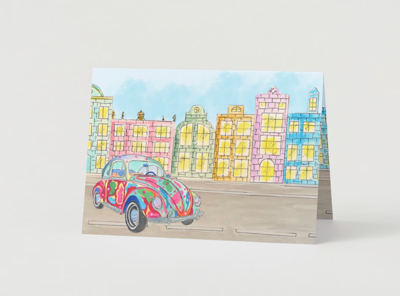 The Colorful Car Card is designed to help you connect with family, friends, and loved ones. It makes for a beautiful card for any occasion. Each card comes with a silver foil interior envelope. The artwork is hand painted by our Artist In Residence.