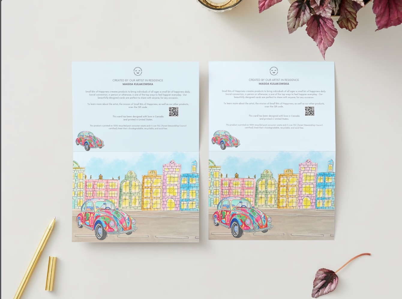 Each Colorful Car Card features an original, hand-painted illustration created by our Artist In Residence, making every card a piece of art in itself. The detailed design bursts with color and character, and the blank interior allows you to personalize your message for any moment or milestone. Printed on high-quality, 100% recycled post-consumer waste paper, this card is eco-friendly, biodegradable, and FSC certified, so you can feel good about gifting something beautiful that’s also kind to the planet.