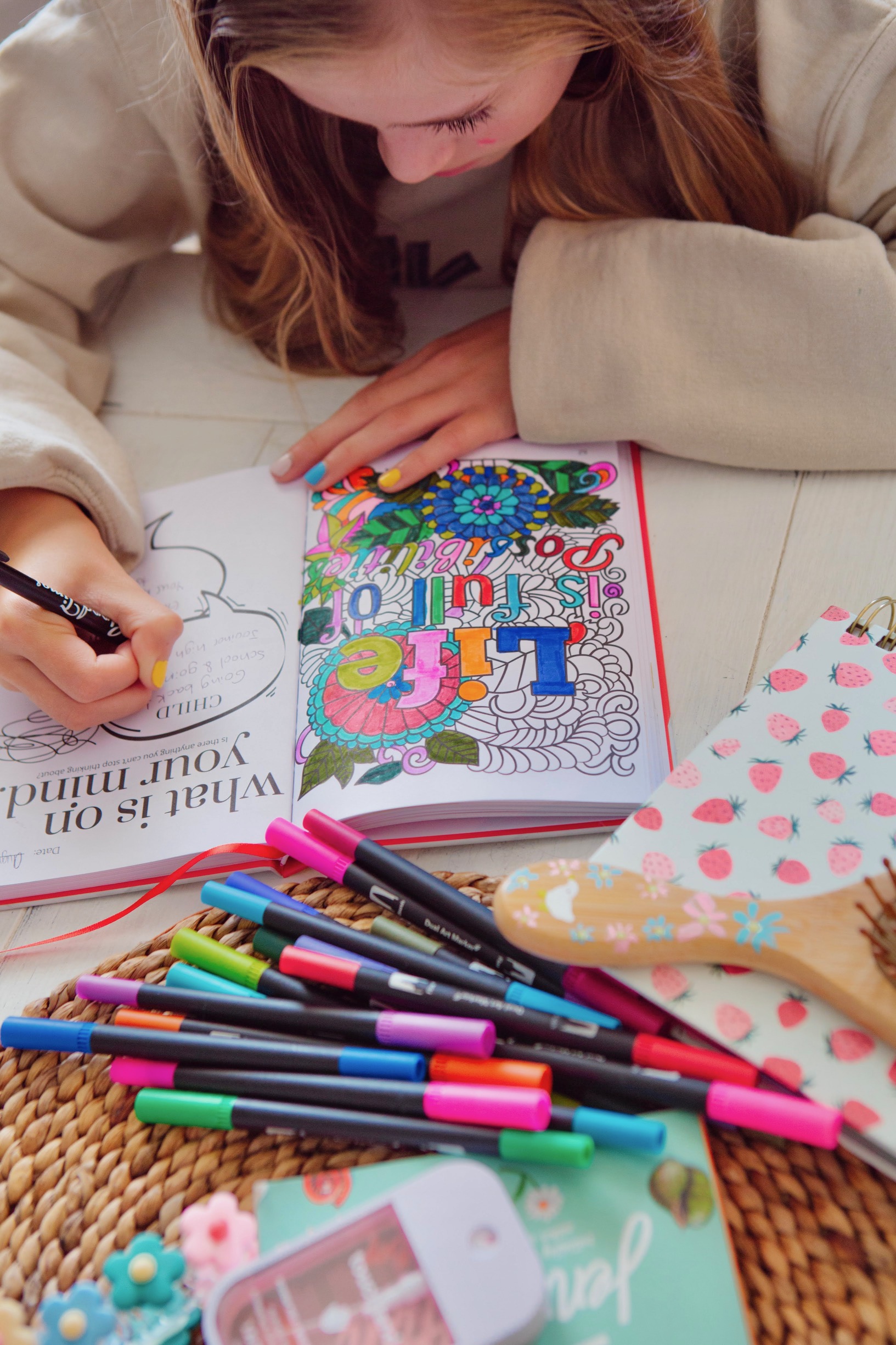 - Happiness-boosting and calming activities and features, including coloring + quotes